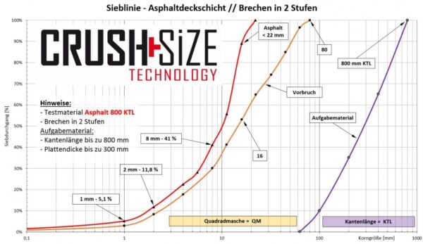 Mit der Entwicklung des Asphaltcrushers hat sich die Crush + Size Technology die Herausforderung gestellt, das sehr aufwendige Handling von Fräsgut, Aufbruchasphalt und Asphaltschollen mit der schonenden Zerkleinerung in einem Brecher zu kombinieren. Ziel ist es, den Straßenaufbruch in seinen unterschiedlichsten Erscheinungen der Platten- oder Schollenform oder des Fräsguts kontinuierlich und mit hoher Qualität verarbeiten zu können, um ein grobkörniges Endprodukt herstellen zu können das kleiner 80mm entspricht.
