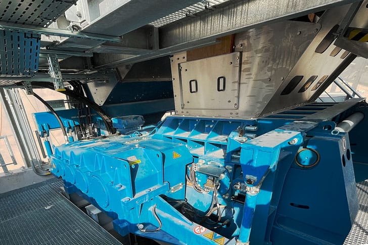 In der Vorbrechstufe werden große Aufgabestücke aus verschiedenen Materialien, darunter stark bewehrter Beton und Naturstein, mit einem DRC 900 auf eine Korngröße von 250 mm zerkleinert. Dadurch wird das Aufgabematerial effizient homogenisiert und der Sekundärstufe zugeführt.
